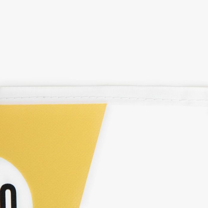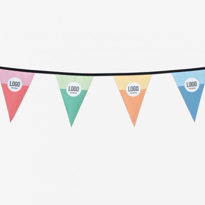 Op zoek naar een feestelijke én doelgerichte manier om jouw boodschap zichtbaar te maken? De vlaggenlijn is ideaal voor promoties, evenementen of bedrijfsacties. Dankzij de puntvlaggetjes aan een sterke band trekt je boodschap de aandacht zonder massieve constructies. Je hebt de keuze uit enkel- of dubbelzijdige bedrukking. De vlaggenlijn is 5 meter lang en bestaat uit 13 puntvlaggetjes, met 10 cm tussenruimte tussen de vlaggetjes. Beide uiteinden hebben 50 cm extra band, zodat je de lijn eenvoudig kunt bevestigen. Voor de afwerking kun je kiezen uit band in wit of zwart, afhankelijk van je design en voorkeur.