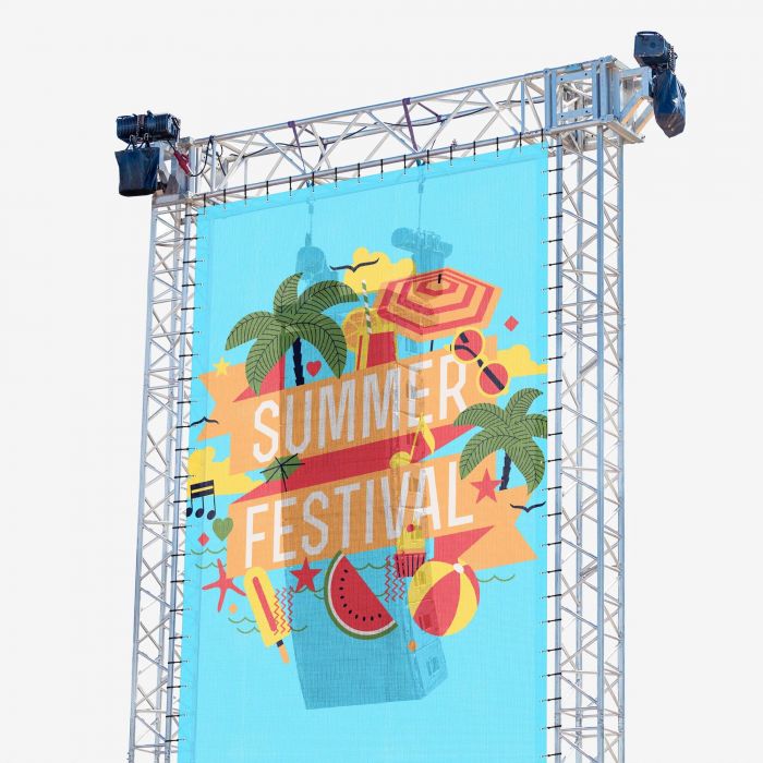 Op zoek naar een opvallende én functionele oplossing om speakertorens op podia of evenementen te bekleden? Het speakerdoek combineert branding met akoestische transparantie, zodat het ontwerp mooi zichtbaar is zonder het geluid te blokkeren. Dankzij de open structuur is je boodschap levendig én blijft de geluidskwaliteit optimaal. Je hebt de keuze uit twee hoogwaardige materialen. Beiden zijn wind- en geluiddoorlatend en hebben een B1-brandcertificering, wat het doek veilig maakt voor gebruik op openbare podia. Het doek kan tot wel 5 meter breed gemaakt worden, waardoor je grote speakerwalls naadloos kunt bekleden.
